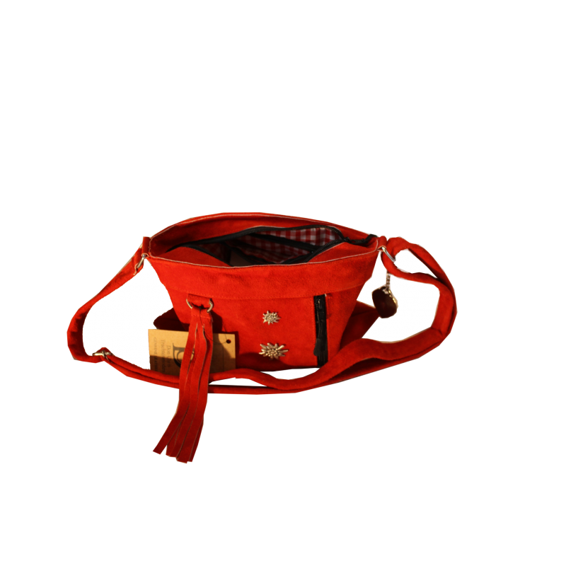 Auffallende Dirndltasche im knalligen Rot. Dieser Hingucker im knalligen Rot, aus weichem Rindsleder, mit seinen silberfarbenen Edelweiß Ansteckern ist ein echtes Highlight. Ein weitere Edelweißanhänger ist nicht im Preis einbegriffen. Mit einer weiteren Innentasche haben Sie ausreichend Platz für verschiedene Sachen. Das längenverstellbare Schulterriemchen wird mit einem Karabinerhacken befestigt.
